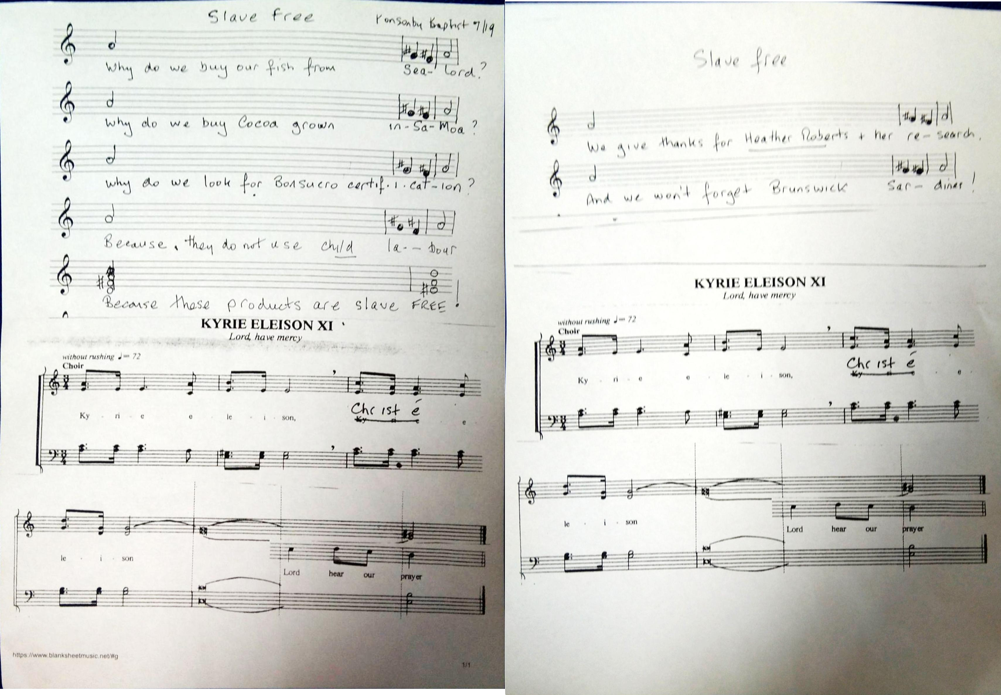 She received a wonderful welcome! In particular, one of the members of the congregation wrote a song about how to buy slave-free food that a group sung before she spoke! Unfortunately we don’t have a recording of that, but here’s the sheet music:
